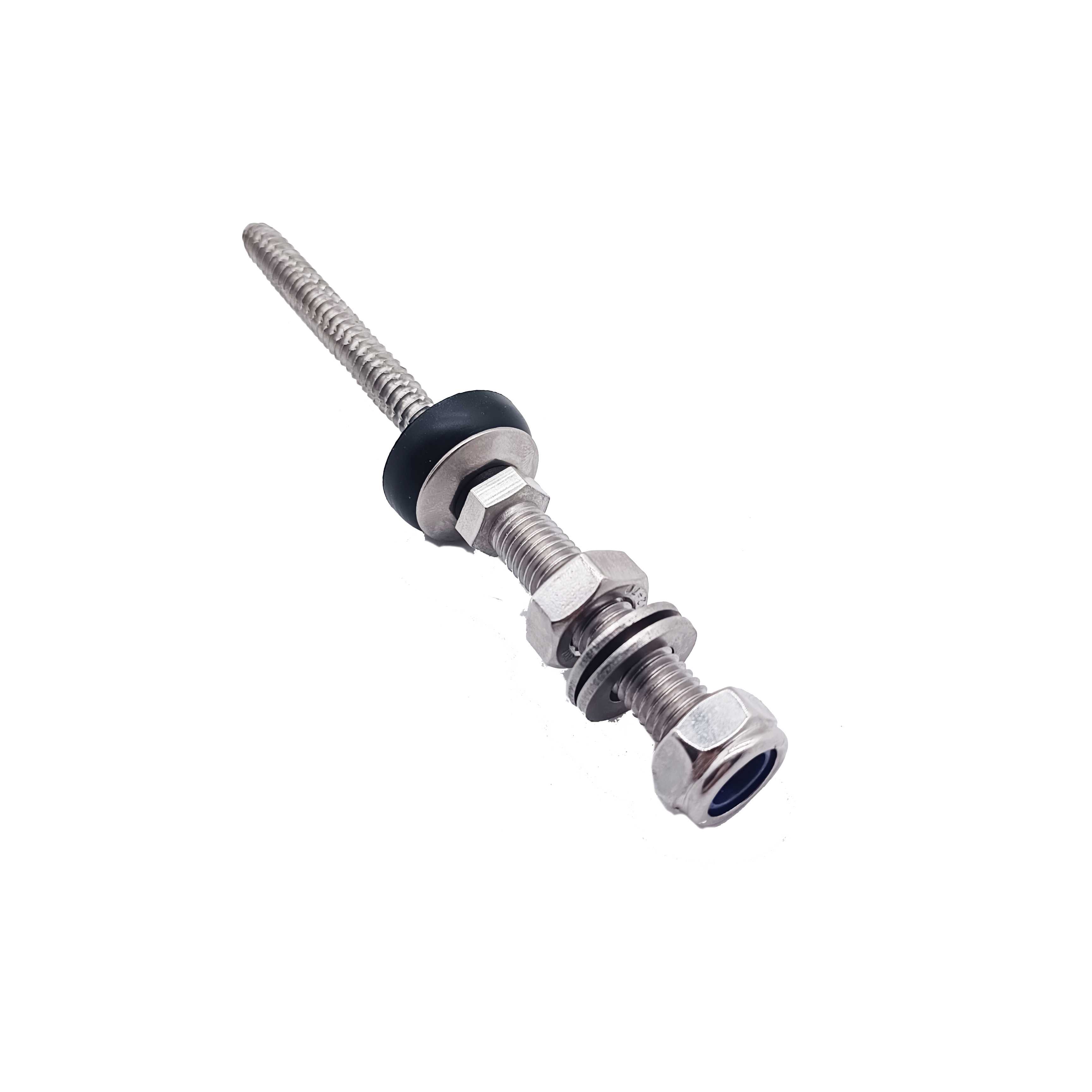 Подвесной болт — это широко используемый аксессуар для системы крепления солнечной крыши. Он изготовлен из нержавеющей стали и подходит для установки на гофрированную металлическую крышу, трапециевидную цветную стальную черепицу, асбестовую черепицу и т. д. Шпильки изготовлены из нержавеющей стали 304 с фланцевыми гайками M10 и прокладками из EPDM, что делает их пригодными для установки на деревянные и стальные балки. Оба типа L-ножек или регулируемых пластин можно использовать вместе.